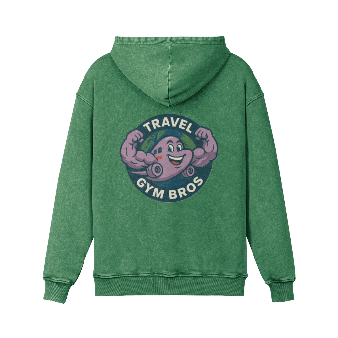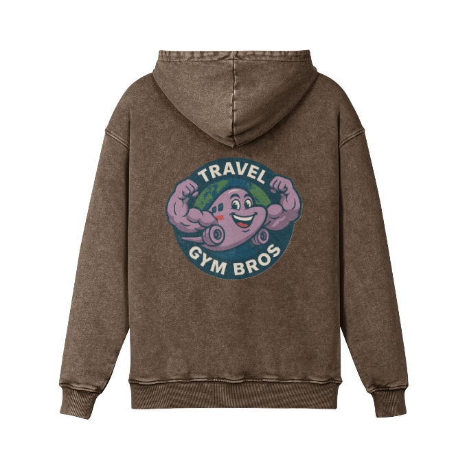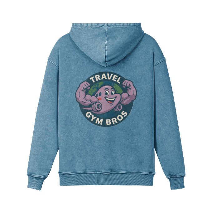 The Unisex 'Travel Gym Bros' Snow Wash Hoodie. Showcasing the Travel Gym Bros Logo. Shaped to a relaxed fit, this well-made hoodie conveys a sense of effortlessness and delivers a casual street vibe that never goes out of fashion. The premium cotton fabric combined with a noticeable washed effect makes it irresistible to vintage style lovers.